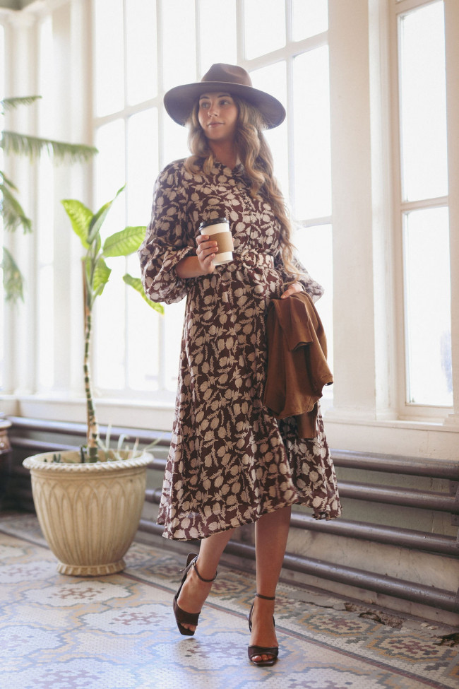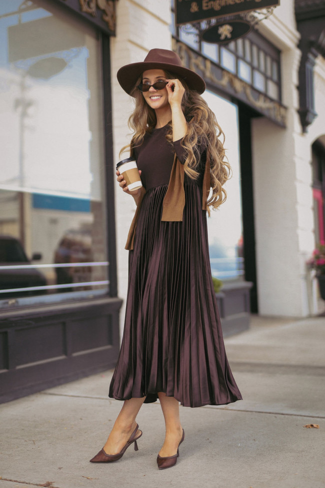 For a blend of comfort and polish, pair an autumn-toned midi dress with a felt hat.