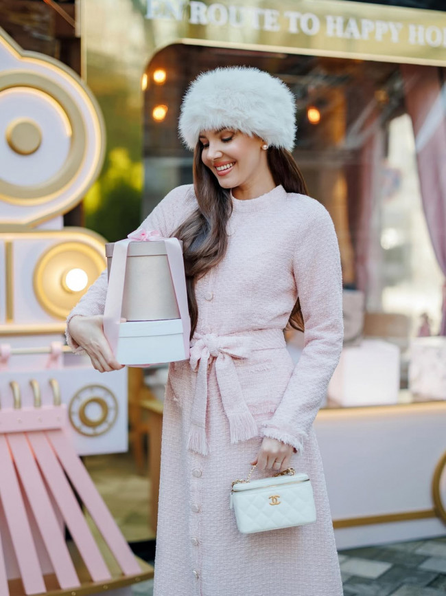 Our Merriment & Memories dress is a customer favorite for a reason! The light pink tweed, fashionable faux buttons, and modest silhouette make for a classic and sophisticated outfit that's just right for the season. Larisa took this dress to the next level, pairing it with chic accessories that are both stylish and warm. Cue your inner Parisian chic in this darling outfit - proving that modesty works for winter, too!
