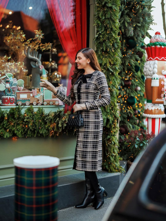 The Ivory Noir dress is the designer dress (for less) of our dreams! The sleek lines and plaid tweed give a bit of a business look, while the velvet bow and buttons keep that classic Dainty Jewells feminine flair. With leather gloves, boots, and handbag, Larisa once again gives this dress a classy chic vibe.