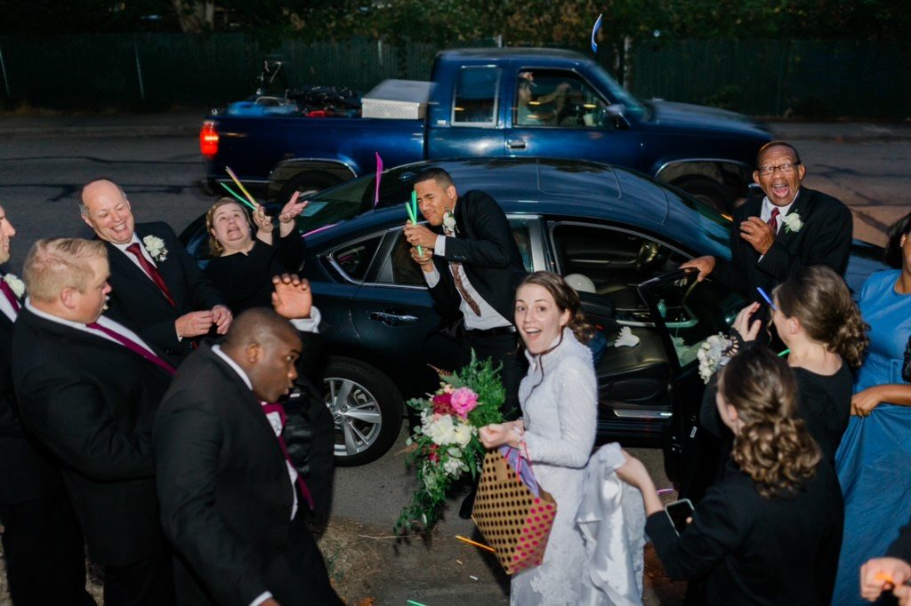 Well, my niece Lilly of course stole the show from the beginning with her cuteness, but one thing that was absolutely hilarious and completely unplanned was our send-off. I wanted something unique and fun to send us off with. I used thin glow sticks, and oh, did all our guests have fun with them! By the time we got down the stairs, some of the people started throwing the sticks over at us like confetti or rice. Thankfully, it was all in fun and completely painless, but definitely something that threw me off and definitely wasn’t part of the plan. It also turned into one of our fondest memories as DJ picked them up and threw them back at people.