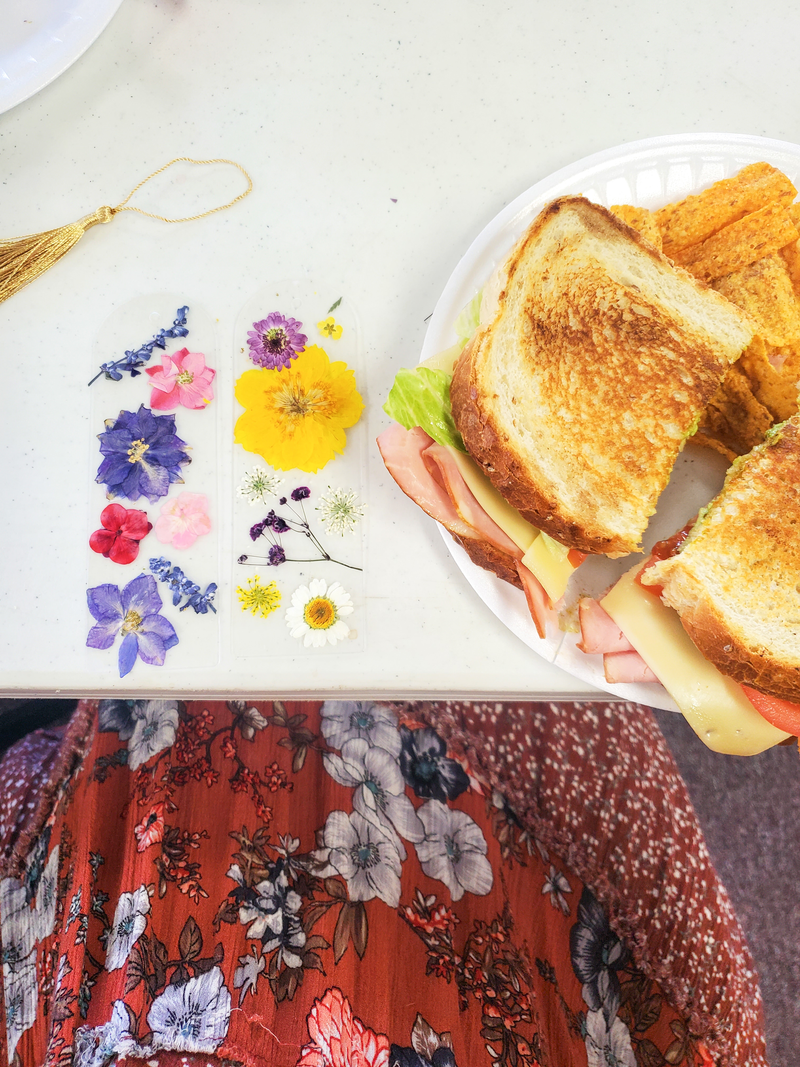 Allow the mod podge to dry completely. We took a lunch break here :) After the first layer has completely dried, go over top the entire bookmark and flowers with another layer of mod podge. This will secure and seal everything.