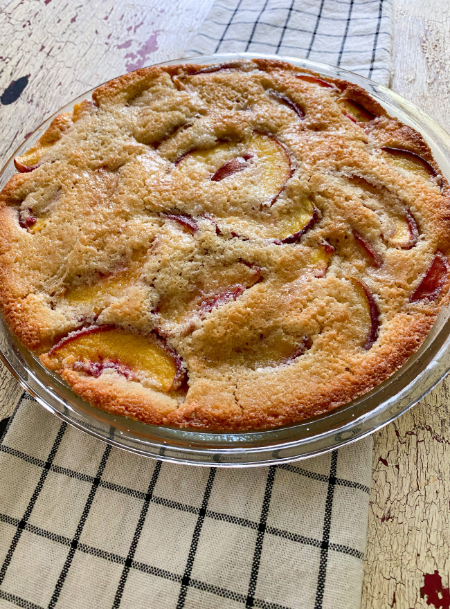 Next, pour your batter into a buttered pie dish, toss in your peaches, and sprinkle your remaining 2 teaspoons of cane sugar overtop.