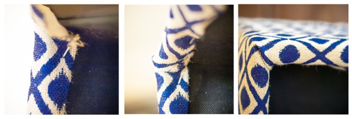 Take your fabric all the way up to the edges and staple, then pull it down and staple. This makes a beautiful corner! So easy! I had to cut my fabric into two pieces for the length of the bottom, so I ended up having a seam on both sides.