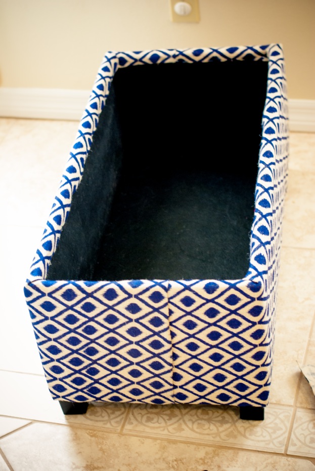 Does it look like I’m missing anything here? Ugh. Yes, the hinges! I did not mark the holes! Putting the hinges back on was NOT fun. It was a complete guessing game. So I got smart when I reupholstered the top. As I covered the hinge holes with fabric, before moving on, I screwed the hinge back in. Thirty minutes of my life could have been spared if I had known that the first time around! Anyway, I lived to tell the tale and I love the finished product.