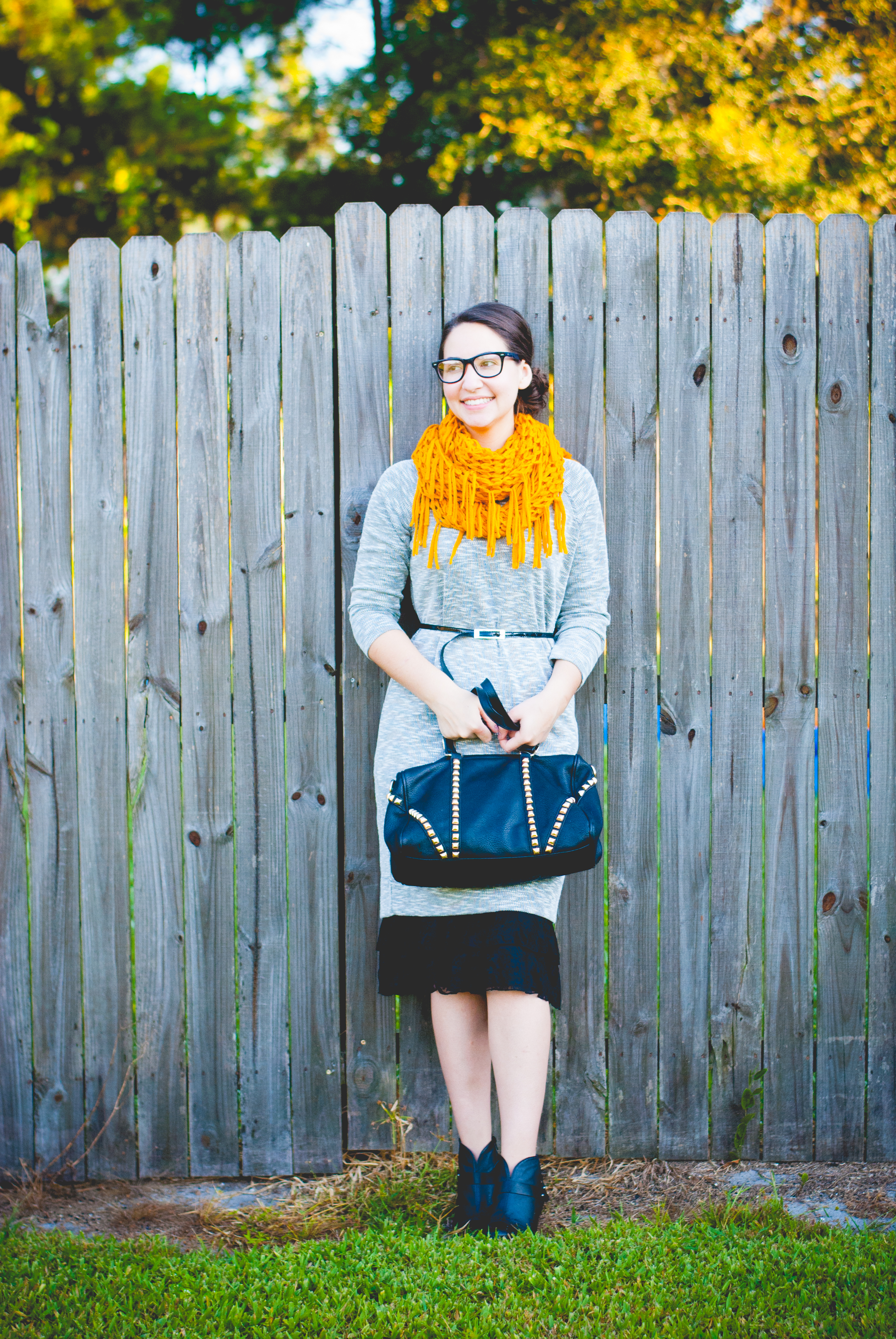 The straight dress paired with frilly lace adds a feminine flair to an otherwise plain outfit and the mixed textures add much-needed interest. Accessories are a cinch with a basic gray dress like this one, because anything goes! I was inspired by the mustard and gray combination of the Dainty Jewell’s Whimsical Sweater Dress and decided to add a chunky mustard scarf with plenty of fringe. I love fringe. I’m not sure why, but maybe it can be chalked up to being born in the 80’s.
