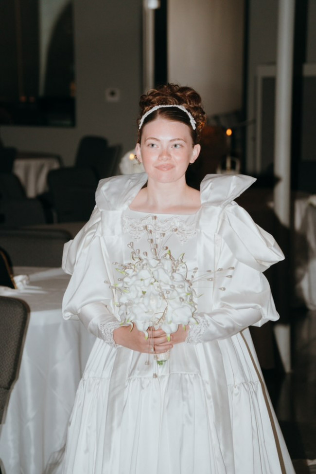 JY: My wedding dress was designed by me and custom-made. My goal was for it to be modest yet extravagant, timeless yet unique, structured yet romantic, and comfortable yet classy. After several design confabs and fittings, my seamstress understood exactly what my vision was and she absolutely nailed it. My dress had a poufy base dress with billowing sleeves and a gathered peasant-style drop-seam for frame-complementing, floating comfort. Then I designed a dramatic cape. Slipping it on added a second layer of features like a five foot train, standing half bows at my clavicles on each side, an extra sleeve pouf and delicate Chantilly lace appliqués. The cape was created to elevate the studied simple symmetrical design of the dress with over-the-top, wow-factor design elements. Sensational and structured is my aesthetic.