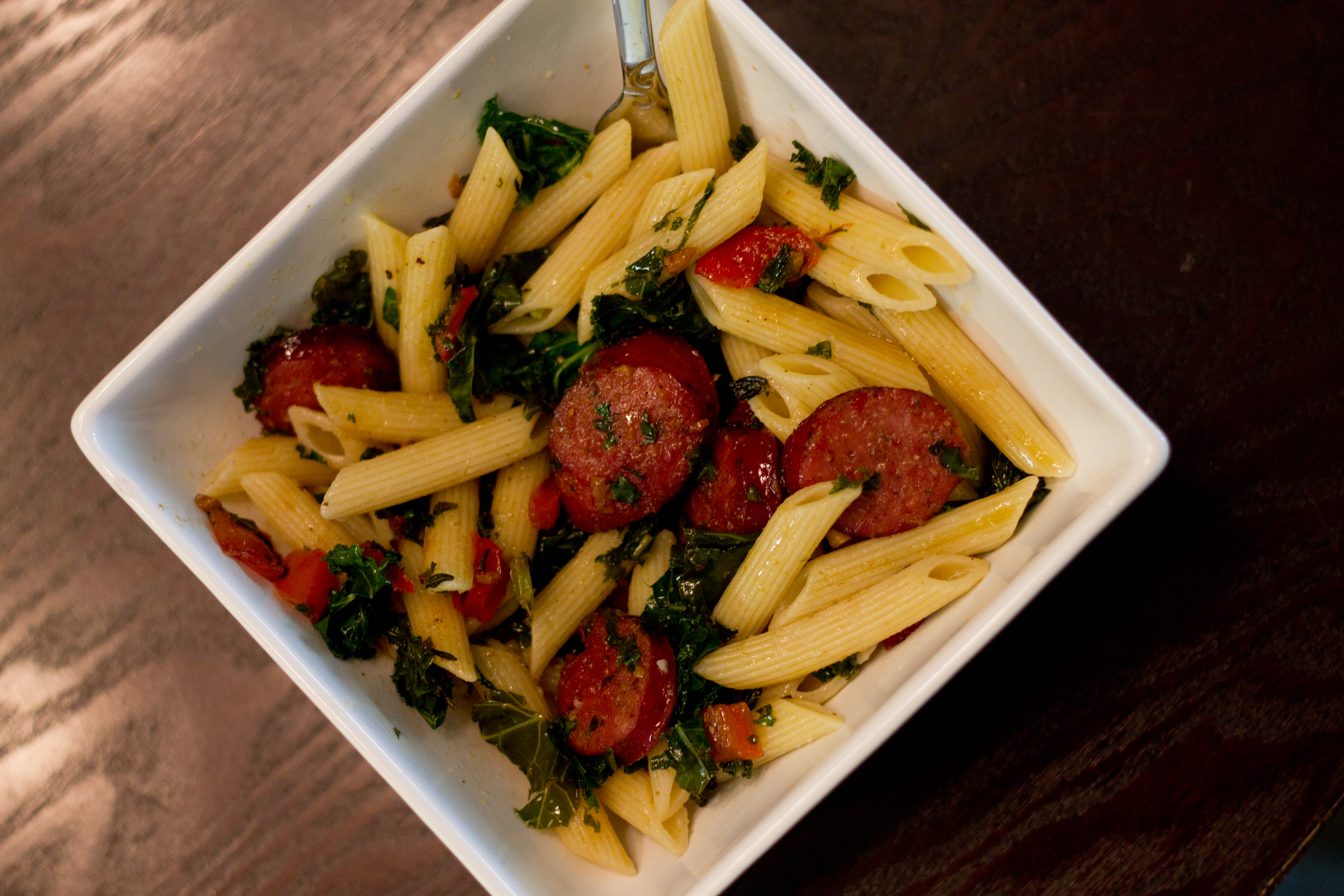 Serve the sausage mixture over the penne noodles and if you have the lemon olive oil, drizzle it over each bowl.