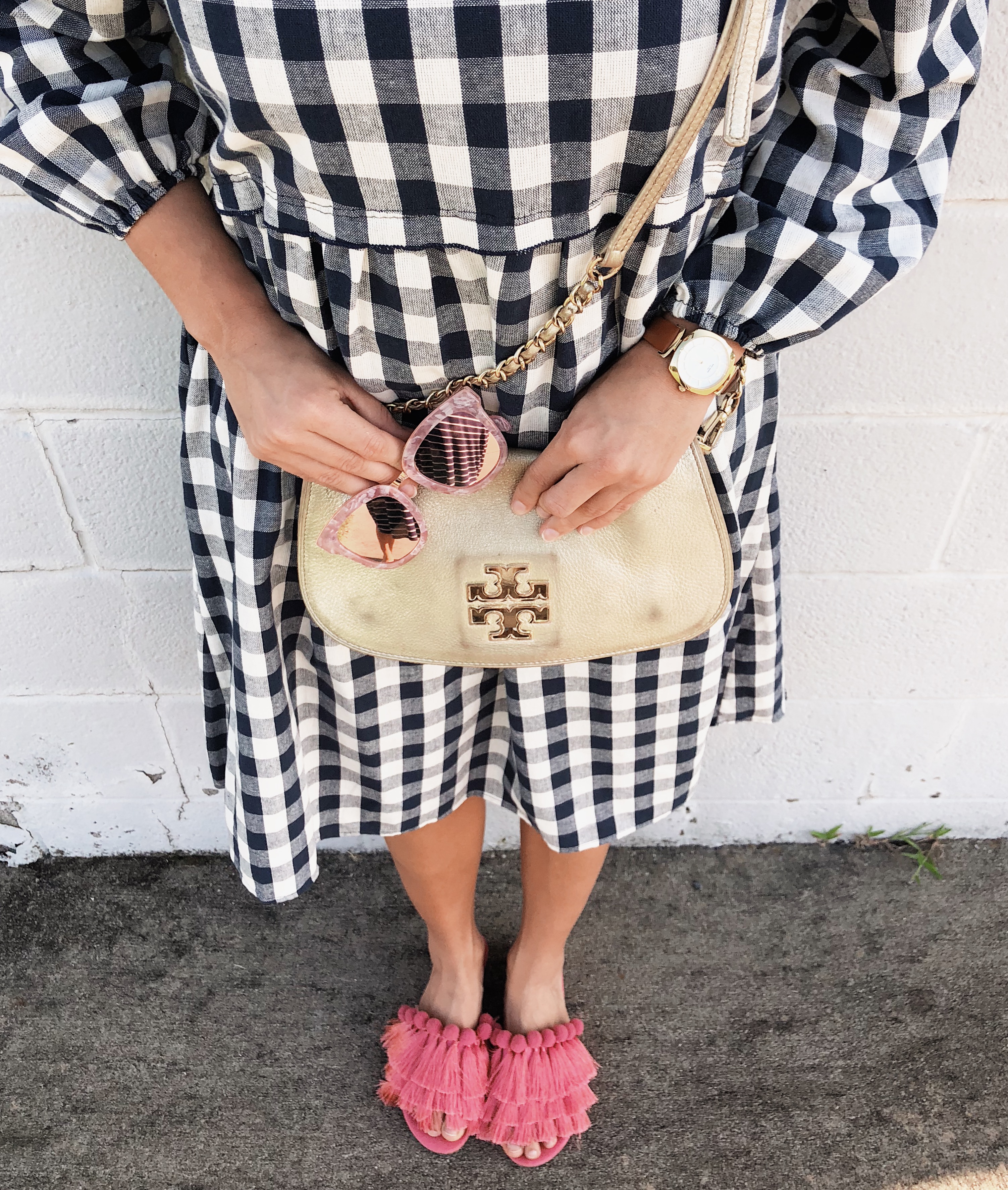 I’ve paired this pretty dress with these adorable pom/tassel slides I purchased from Versona for only $6! I am still undecided if they look like house shoes or not, but for $6 I just couldn’t pass them up. My sunglasses were also purchased from Versona sometime last year.