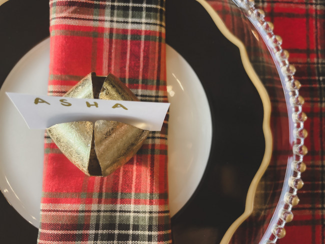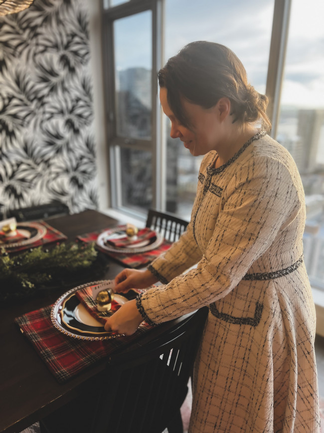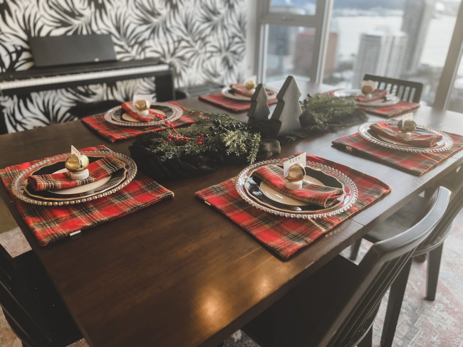 My Christmas tree is decorated in red, green, black, and white, so I went with those more traditional colors for the table. I wanted something that felt fancy but still warm and inviting. Pairing these fancier plates and chargers with the Christmas plaid did the trick for me!