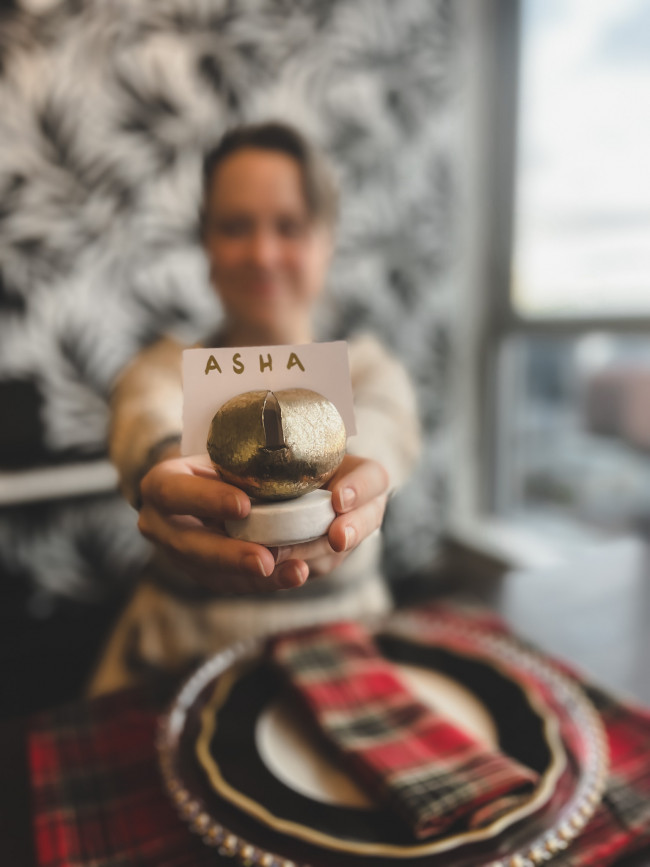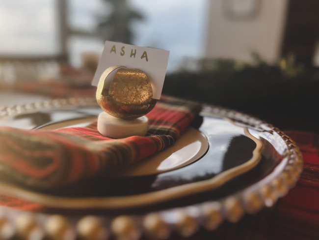 This close to the holidays, Christmas decor is usually on sale. So if you're picking up a few things last minute, you'll actually save money! I hit up Hobby Lobby, and everything I purchased was 60% off. I ended up spending only $100 on placemats, chargers, plates, napkins, and place-card holders for a party of 6.