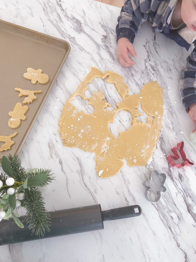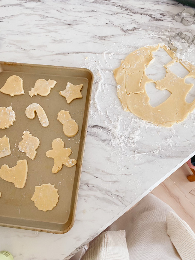 6. Roll cookie dough to a 1/2 inch thickness. Use cookie cutters in the desired shape and place on an ungreased baking sheet with 1 inch between each cookie.