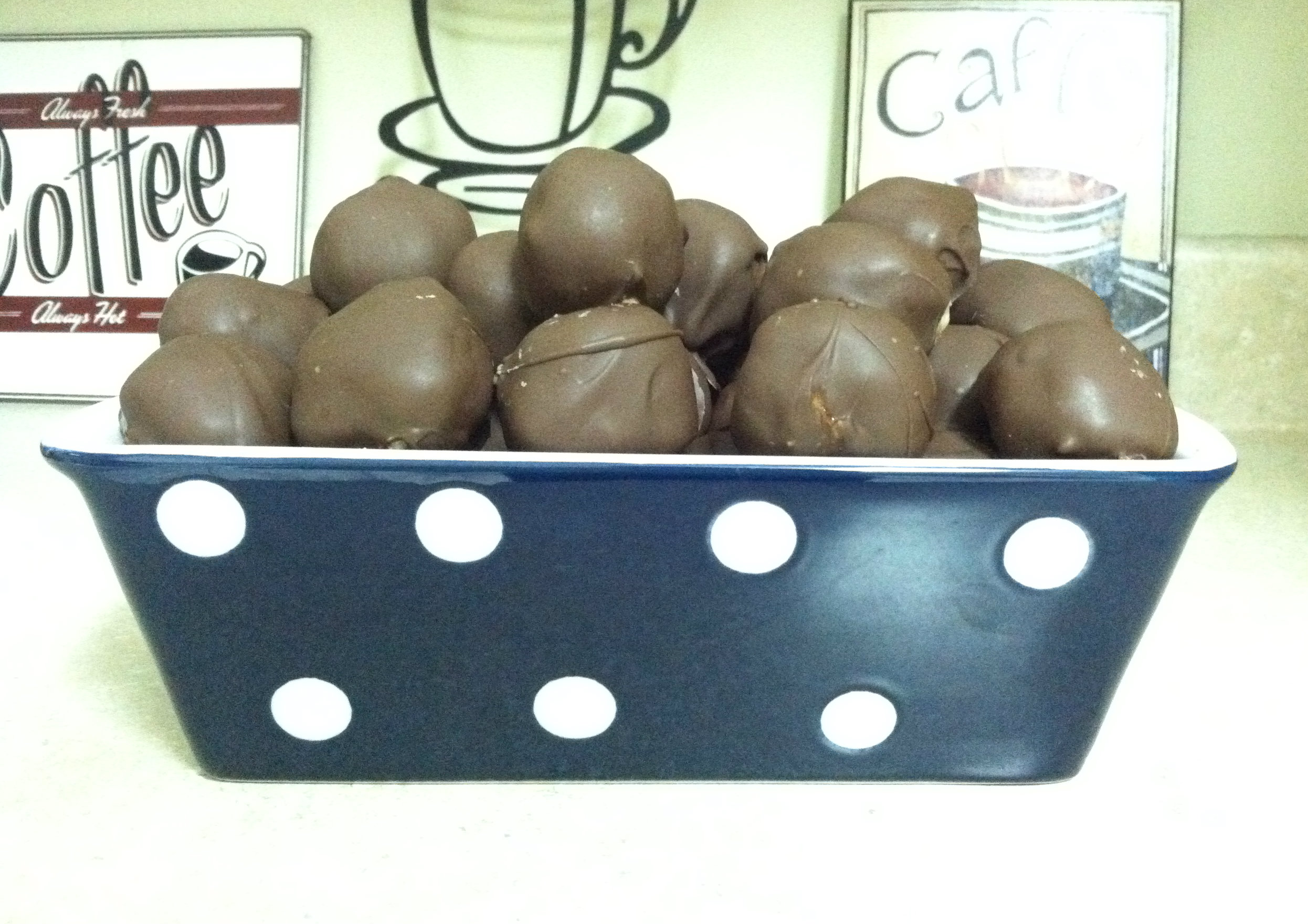 4. Dip each ball into melted chocolate; place on a cookie sheet until chocolate hardens. These freeze beautifully and can be eaten frozen or at room temperature.