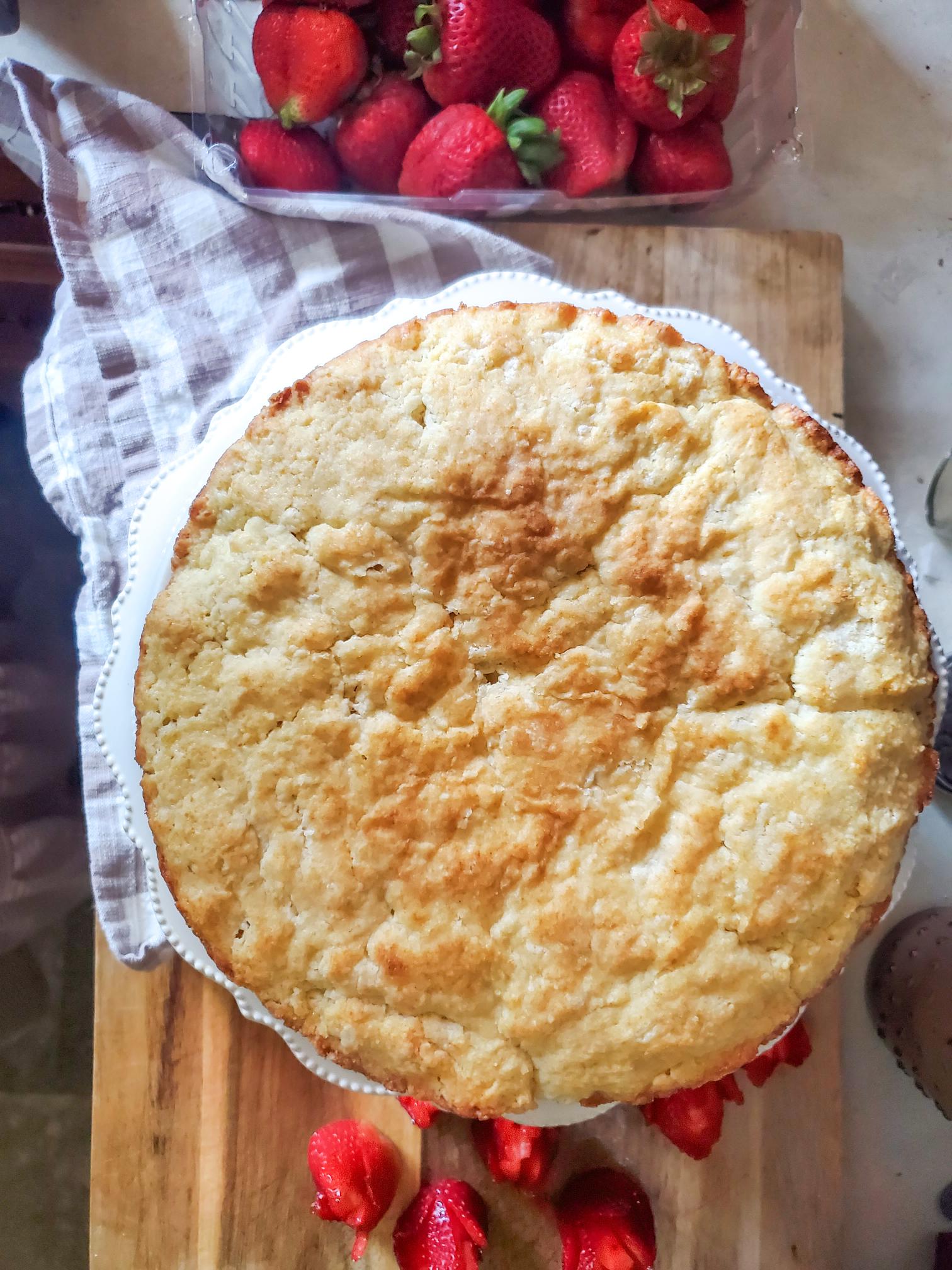 When ready to assemble, use a mixer to combine the heavy whipping cream and powdered sugar until soft peaks form. Be careful not to overmix. Spoon whipped topping onto the cooled shortcake.