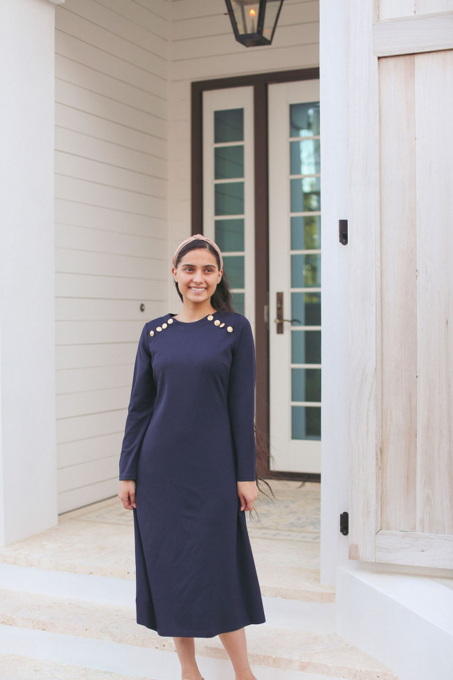 There's nothing so classy as a simple sheath dress in a neutral color, and the Summer in Concord dress fits the bill to a T. The gold buttons on the shoulder add the perfect detail!