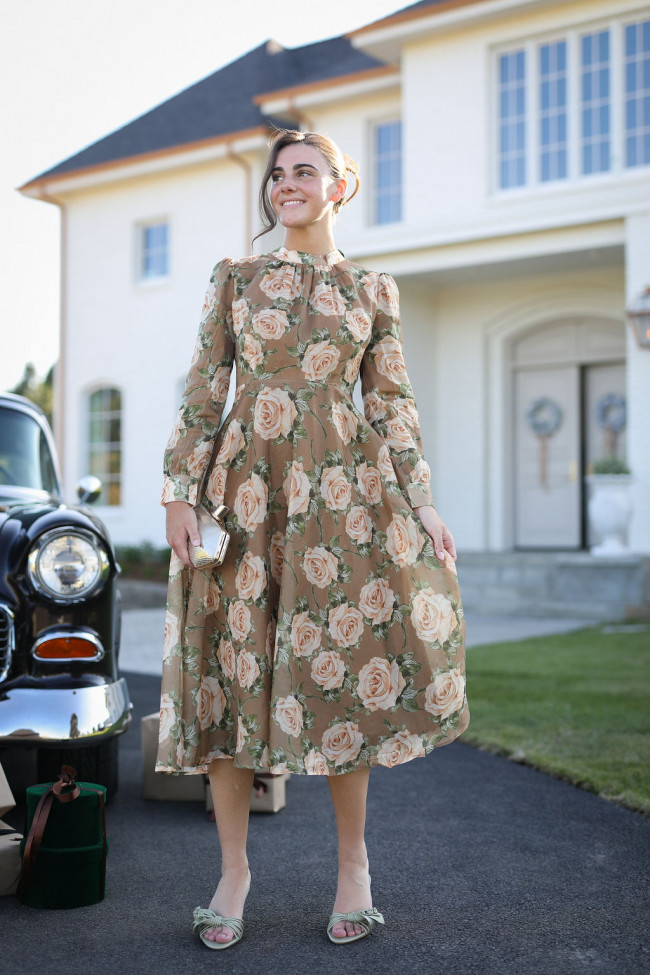 Who says florals are just for spring? Our winter floral dress features delicate prints in muted tones and the daintiest dark green velvet bow at the back neck. The full-length silhouette (available in midi and maxi) and long sleeves create a romantic, feminine look that’s perfect for evening gatherings.