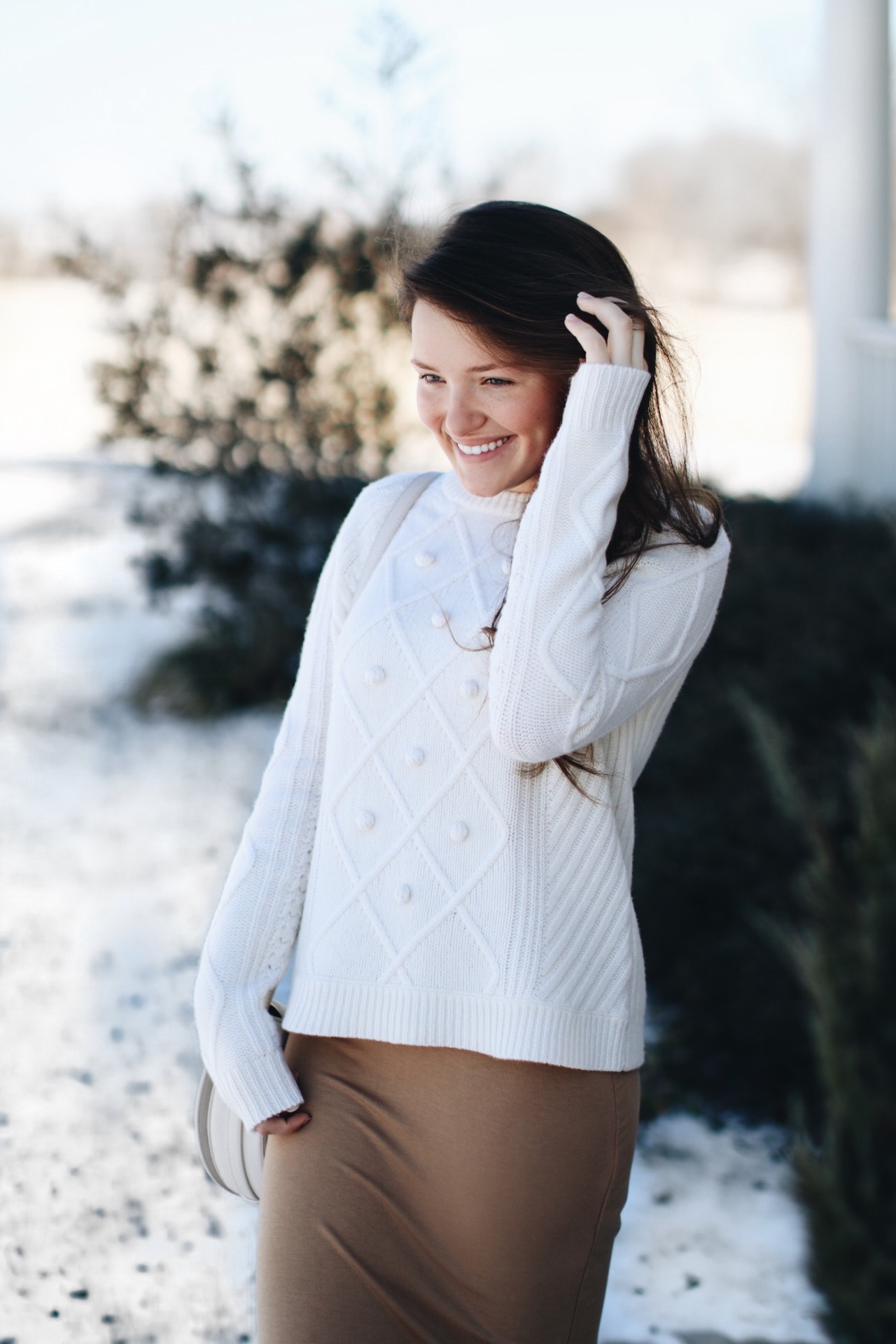 I wore this super warm merino wool sweater that has super cute details. This is one my new favorite sweaters for winter. It’s thick, but still looks great on! It’s on sale right now and you can usually get 30-40% extra off of the sale styles. Speaking of sales, I purchased this tan skirt for only $4 on Black Friday! These skirts are a little form fitting, so I recommend going up a size. But, they’re a great basic skirt with longer vests and tops!
