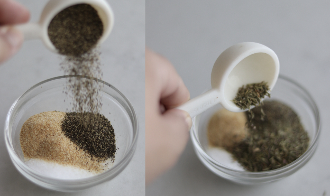 Combine equal parts of salt, black pepper, garlic powder and dry thyme. (1 Tbsp of each)