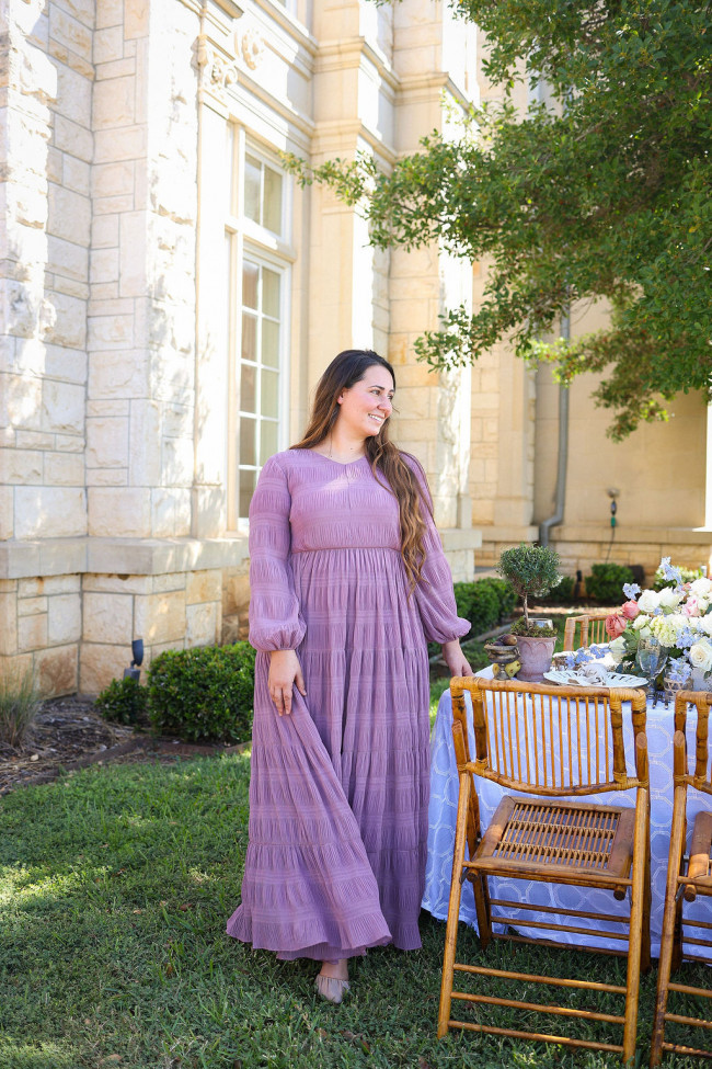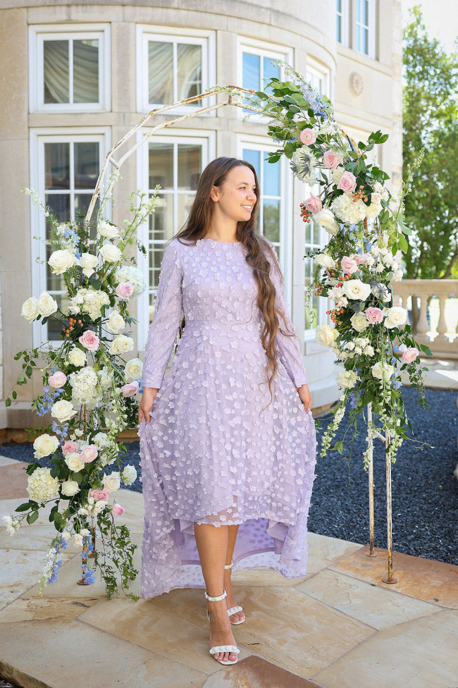 High-low hems are stylish and elegant while still being modest. Go for a classy look with a A-line silhouette and long sleeves in a soft spring color, like lavender. Embroidery, texture, or dainty flowers adds an extra touch of femininity.