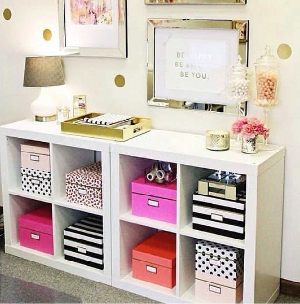 My first favorite office/room decor trend that I have already implemented is the shelving unit. Guys. Wow. That is truly all I can say. I purchased a fifteen-compartment shelving unit about a month ago, and I am still just as in love with it as when I first made the purchase. I currently have one shelving unit that houses all of my favorite shoes, and the other holds colored bins like the picture below. This trend is a must have for all of you type A/perfectionists out there.