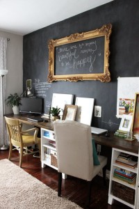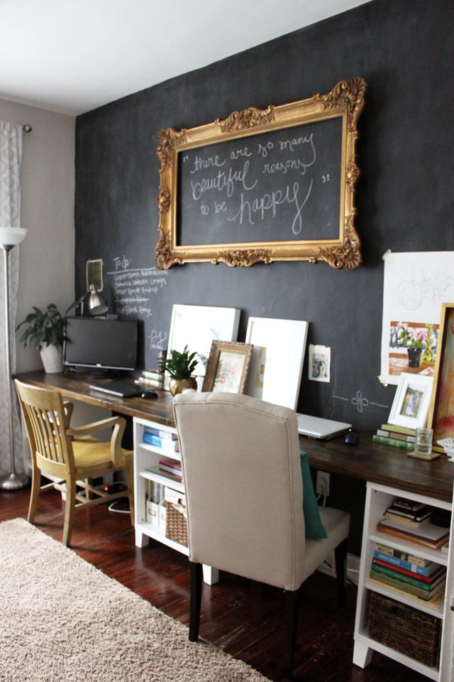Chalkboard paint. If you are really feeling like spicing up your life and doing something completely drastic, then chalkboard paint might be perfect for you. I love how this particular office only features one wall painted with chalkboard paint. This wall is the focal point of the entire room and gives the space an elevated look without being too stuffy or boring. This is definitely a trend to attempt if you want something really innovative.