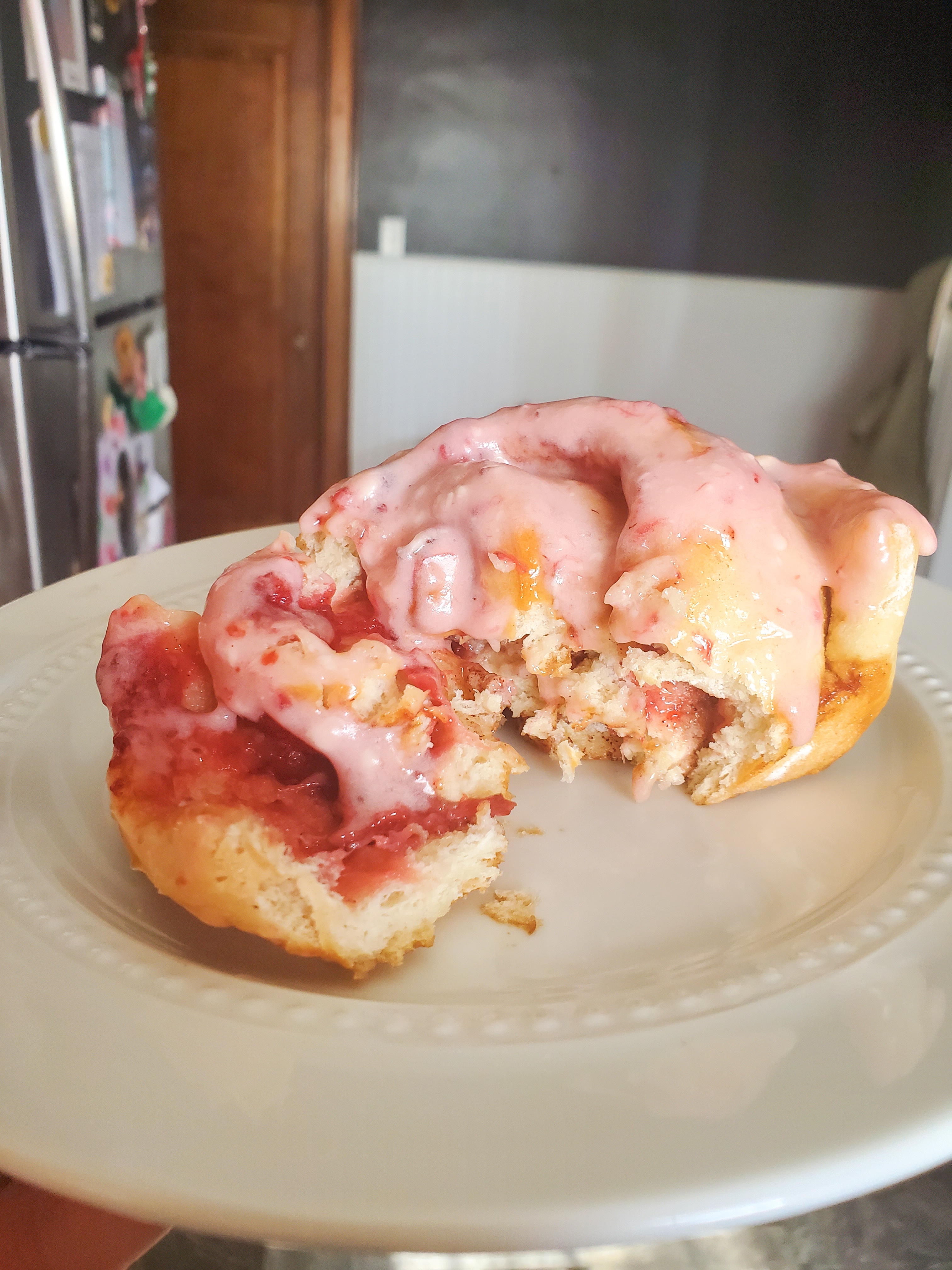 Happy Spring, friends! I have been so excited to see more and more fresh produce available at my local supermarket as the weather has begun to warm up. As a mom of two, I always try to keep a few different fruit options on hand for snacks and recipes. Recently I had extra strawberries on hand and wanted to incorporate them into cinnamon rolls!