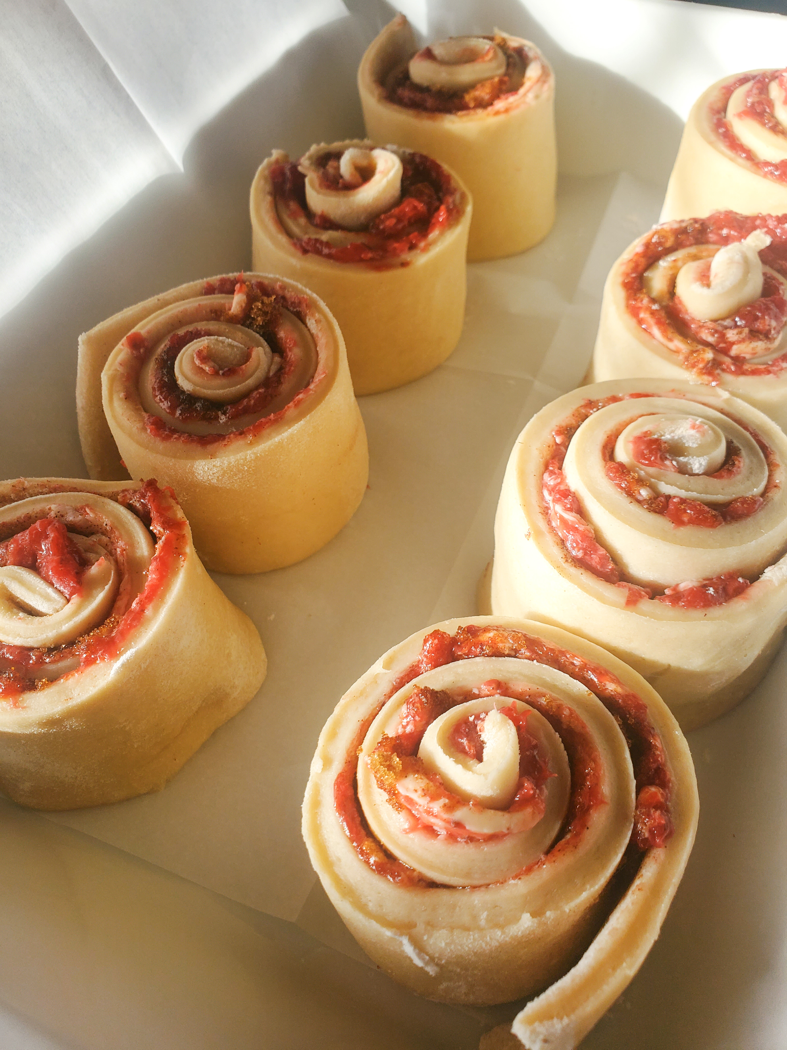 Once risen, flour a flat surface and roll out the dough into about a 14X18 inch rectangle. Spread the softened butter across, followed by the strawberry jam and, lastly, sprinkle with brown sugar. Use a pizza cutter to cut 8 even strips and roll each into a cinnamon roll.