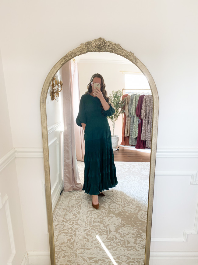A flowing maxi dress is so elegant on an expecting lady. The Send My Love dress is another versatile piece that can take you from casual brunch to a church service.