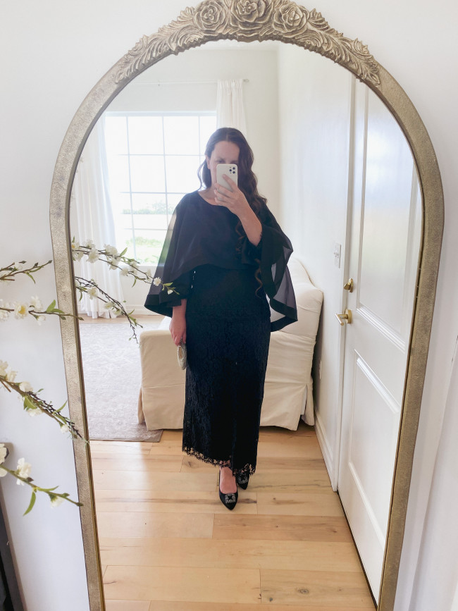 The Belle of Buckingham dress will be your go-to for formal events. The black lace, dainty kick pleat, and attached cape are the most gorgeous details. This dress is the perfect choice for black tie events, weddings, banquets, the symphony, and so much more.