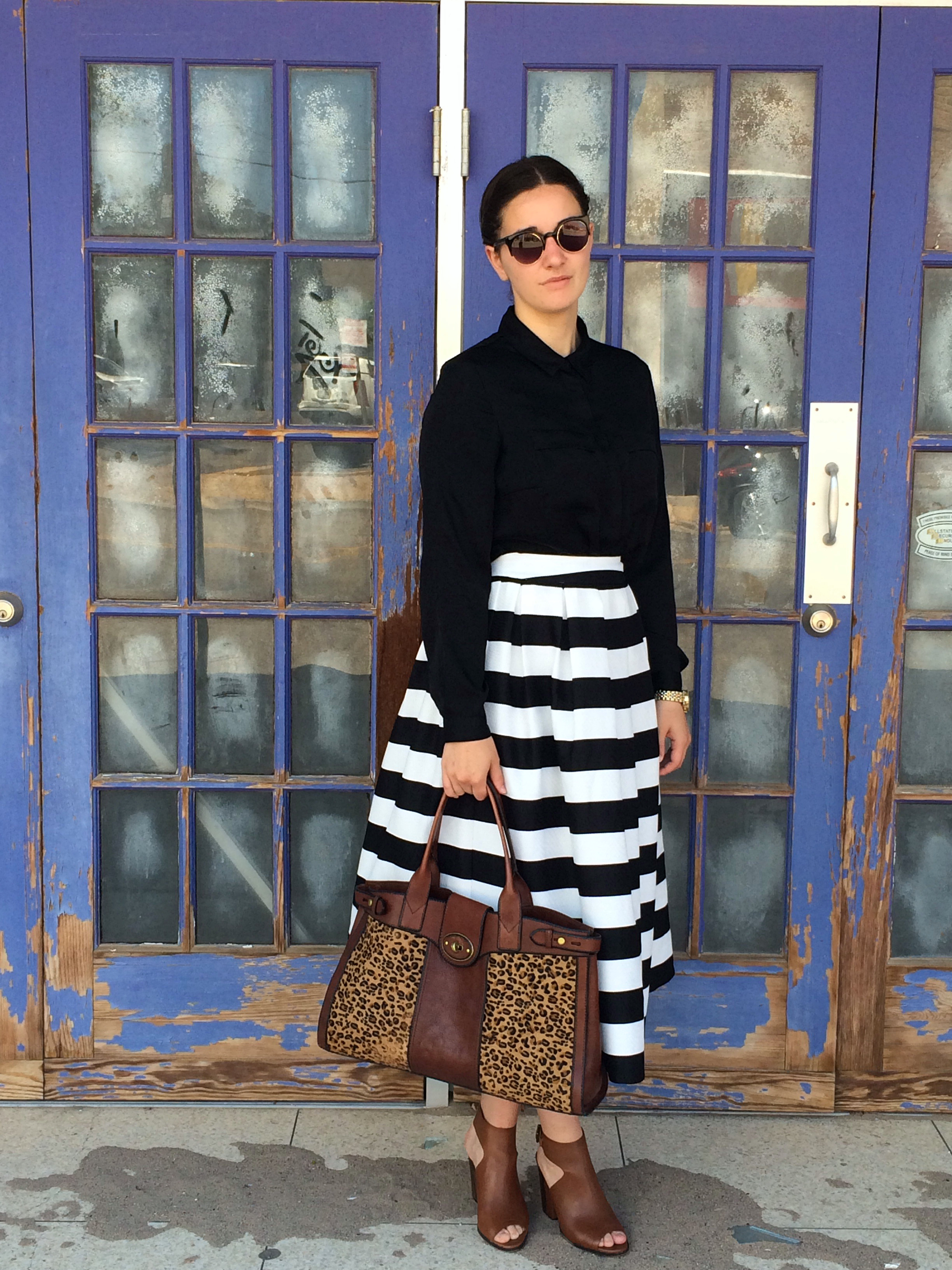 Stripes and leopard: this pattern combination makes the simplest of outfits pop. In this particular outfit, I paired a black-and-white flared midi-skirt from a local boutique (but the style is everywhere right now) with my favorite leopard purse by Fossil and a silk black button-up by Mango to provide a neutral area so the statement items do what they’re meant to do — make a statement.