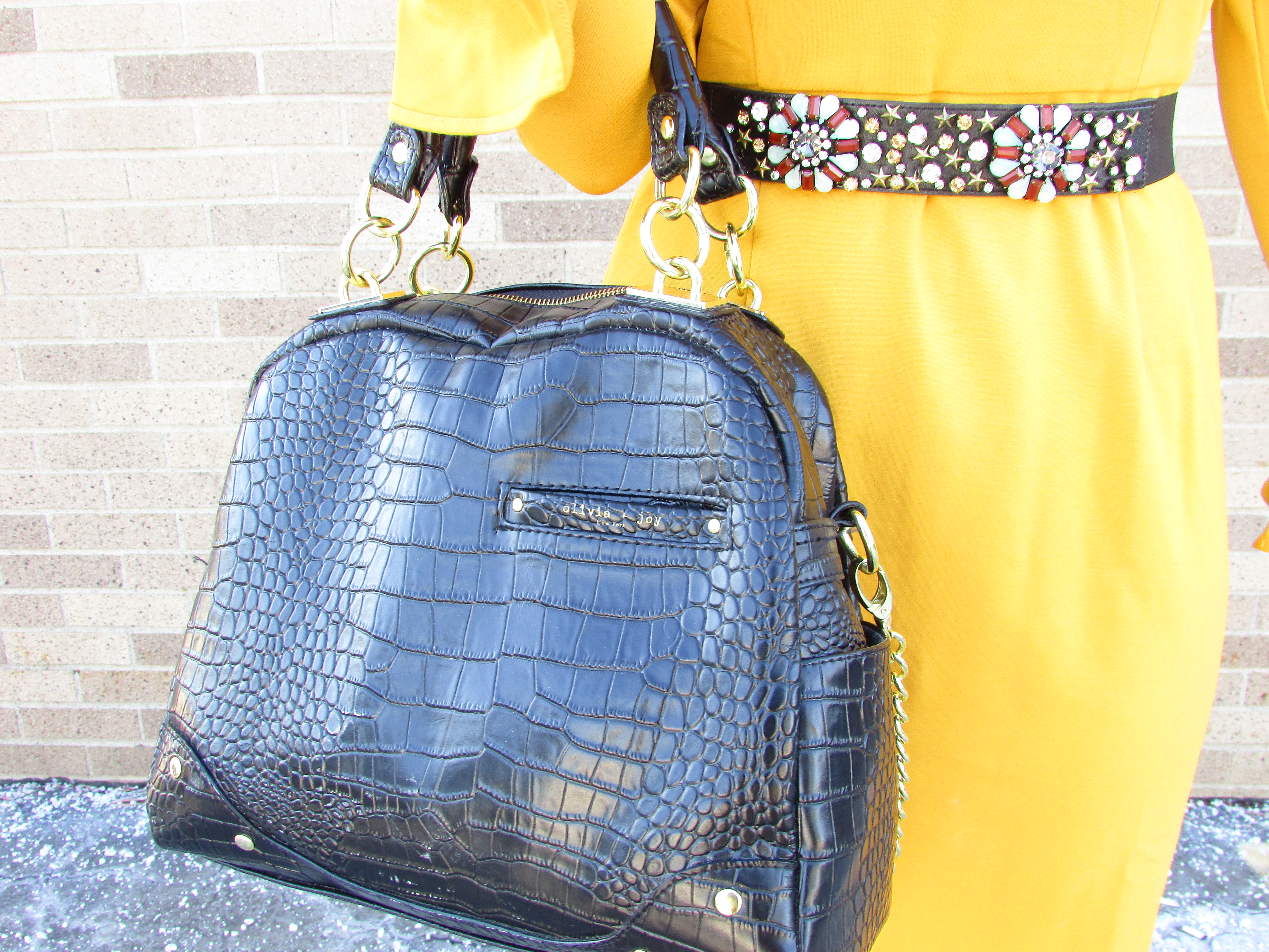 I knew that I wanted to add some edge to the very feminine dress, so I decided to add my strappy black heels. These heels are very edgy and serve as a perfect contrast to the dress. For my bag, I opted with a snakeskin bag that once again went with the edgy theme of the shoes.