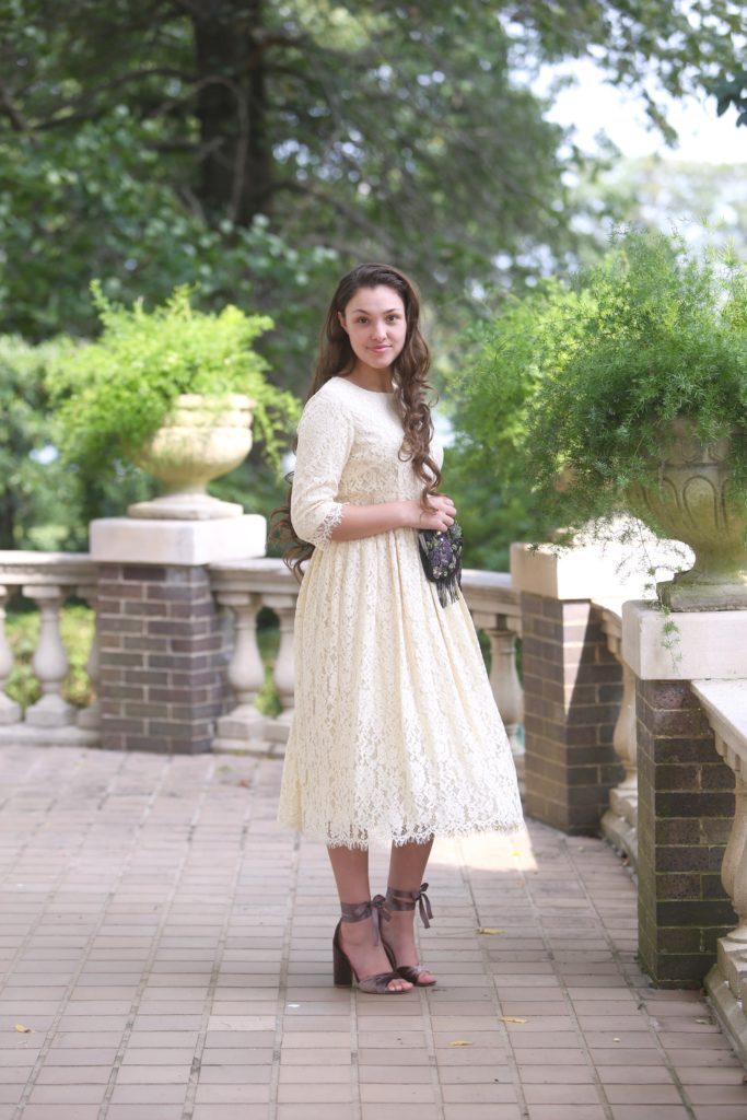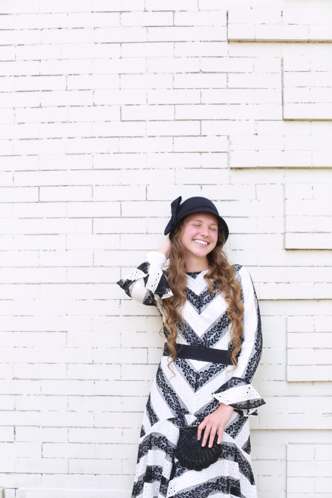 I remember going thrifting with my best friend to look for those one-of-a-kind unique vintage pieces for the conference. I ended up finding a white Liz Claiborne short-sleeve 90s-style white linen dress. Of course, it came above my knees — and this was before layering slips were a thing. So I went to Joann’s and found a dupioni silk. From there, I added three ruffles to the length, a ruffle on the sleeves, and a ribbon bow: plain and simple, but MODEST and not LAYERED.[
