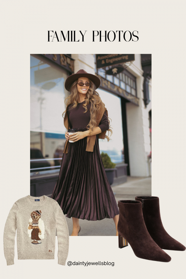 My first thought when I saw the photos of this dress was moody, warm fall family photos! I plan to layer a cozy, trendy sweater (either draped over the shoulders or worn to let the pleats peak out) and add some chic, suede ankle boots. The vibe is classy and I can easily style my husband and two boys in masculine tones like brown, navy, and green.
