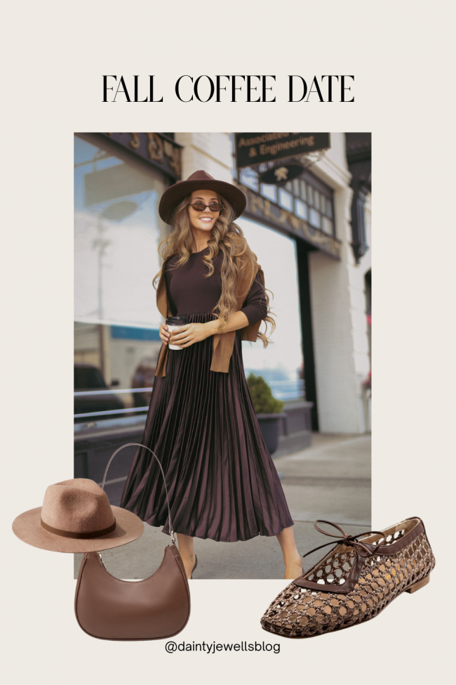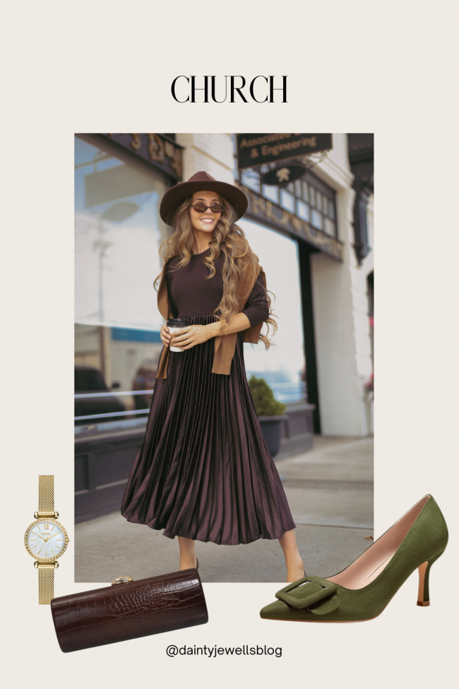 Our final autumn drop releases today, and we are thrilled with the complete Dainty Jewells Autumn collection! It's so difficult to choose a favorite, but this finale collection - the Chestnut Glow - just might be the winner for me. The rich, warm tones are trending this fall, and I can't get enough of deep brown hues. One of our classics has returned this year in 3 gorgeous colors - burgundy, beige, and now, a chocolate brown. The Memorable Moments dress is a staple piece (there's a reason it sold out last year!) that will take you easily from the warmer fall months into chilly winter. I'm certainly snagging the dark brown one once the collection goes live! Here is how I plan to style this stunning pleated midi dress: