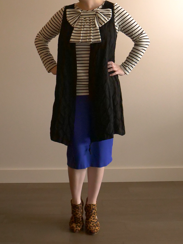 Because the bow isn’t tacked down at the edges, you can easily add a vest, blazer, or even v-neck dress over the top. For this look, I also added a bold pop of color with my cobalt blue skirt. Check out these colored denim skirts from Peony Street Boutique. (More mixed prints, anyone? I couldn’t resist the leopard print shoes!)