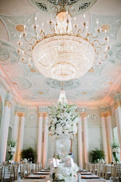 The location in the image above is particularly stunning because of all the massive chandeliers. However, I also love the table setting. You could obtain a similar, yet still breathtaking look, with the use of only one large chandelier and create a similar effect.