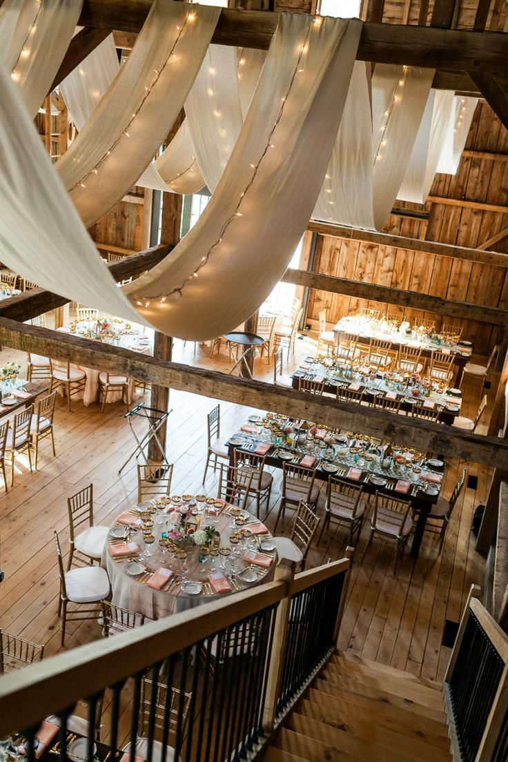 Barns are a recent favorite venue for weddings. They have a gorgeous, rustic affect that many brides find appealing. This rustic decor look can be achieved simply by mixing various, rustic elements with classic pieces. They mix the traditional white table cloths, white plates, and lovely pink cloth napkins with the barn location, the white lights and the white fabric draped along the ceiling beams. This look is one of my favorites!