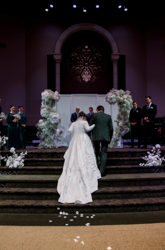 I wanted all white florals and a mixture of real and synthetic to give a full but extravagant look for half of the price. I couldn’t find picture inspiration for what I was envisioning, so I made a sketch just from what was in my brain and so many people helped put it all together.