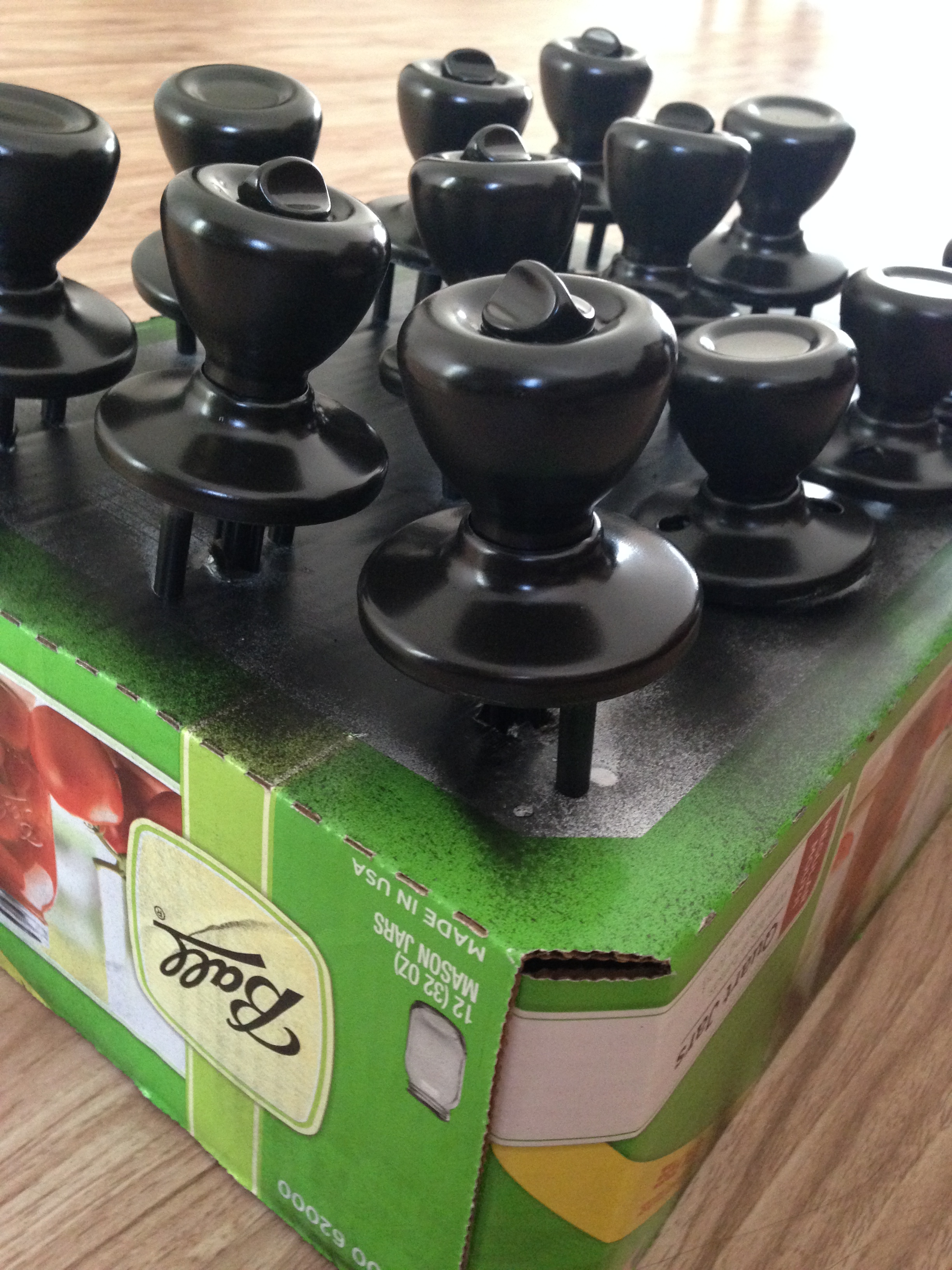 When it comes to spray painting, a cardboard box is your friend — you can see mine has been pre-loved. I started by cleaning the knobs off with a multi-purpose cleaner. As with any slick surface, it’s a good idea to get grease or dust off of it before painting. I put the knobs in the box and gave them a light coat of paint. I quickly realized I couldn’t get to every side of the knobs with them inside the box, so I flipped the box over, poked the knobs through and they stood up perfectly while I was able to spray every angle.