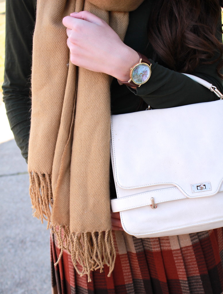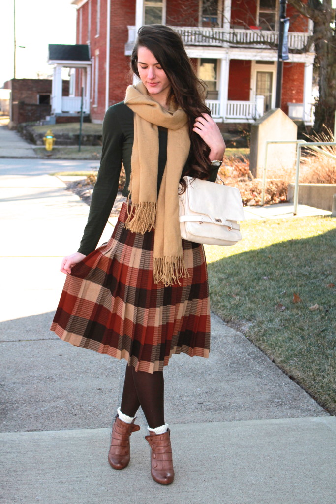 One perk to wearing urban style is that you can be frugal when it comes to shopping. I found this adorable pleated plaid A-line skirt at a local Goodwill. I love how rich and vibrant the colors are along with the uniquely styled pattern.