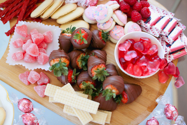 I started with a cute board and a few sweet treats. You can adjust to whatever suits your fancy, but I chose small, pretty cookies, vanilla wafers, fancy chocolates, red and pink candies, raspberries, and chocolate-covered strawberries.