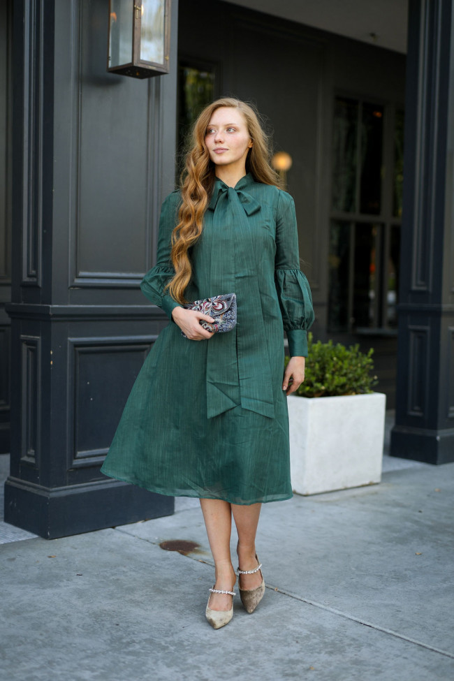 A family dinner or festive brunch calls for something chic yet comfortable. Think long-sleeve midi dresses in rich jewel tones like emerald, burgundy, or navy. A high-neck bow dress offers elegance without feeling overdressed. Pair it with suede boots or heeled loafers for a polished, warm look.