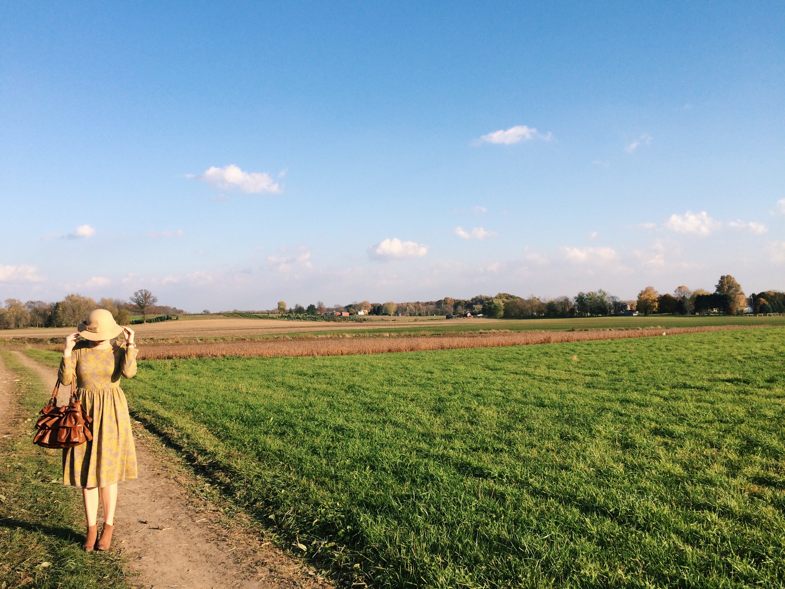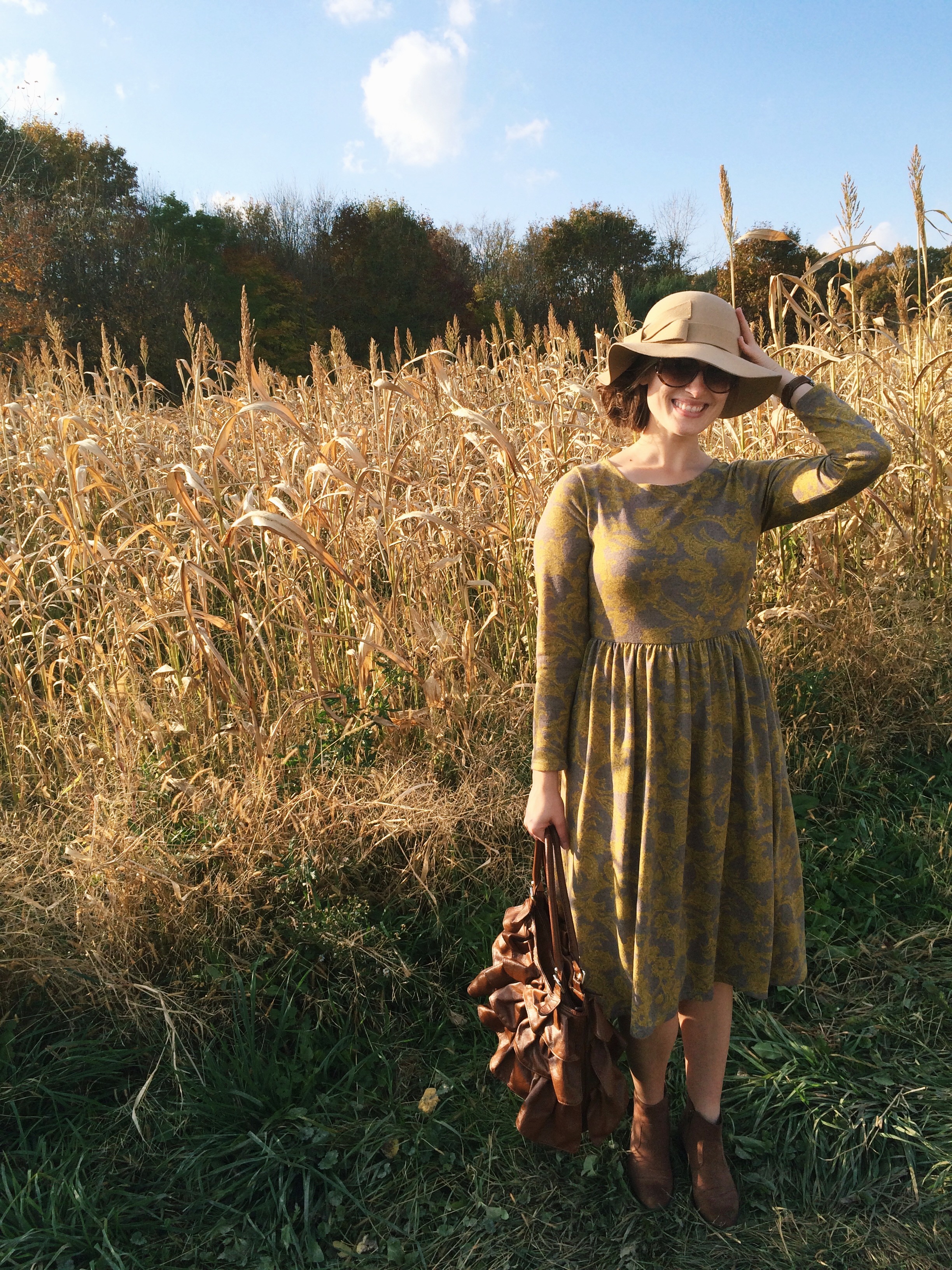 Then, this weekend, I wore it as pictured to a pumpkin patch and corn maze. SO MUCH FUN! Saturday was considerably warmer than it had been the rest of the week, so I ditched the tights in favor of no-show, lace socks with the brown booties and was comfortable all day long. I highly recommend the dress for this season and the coming winter. I can’t wait to wear it again with boots and a scarf in the next few weeks!