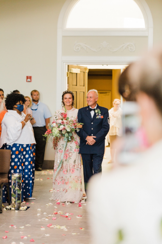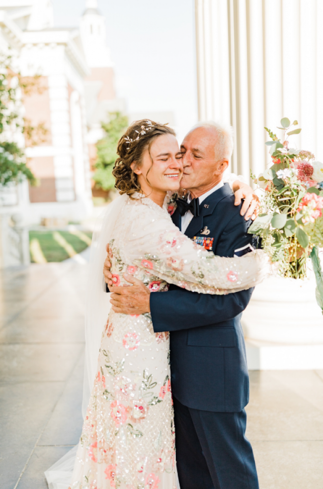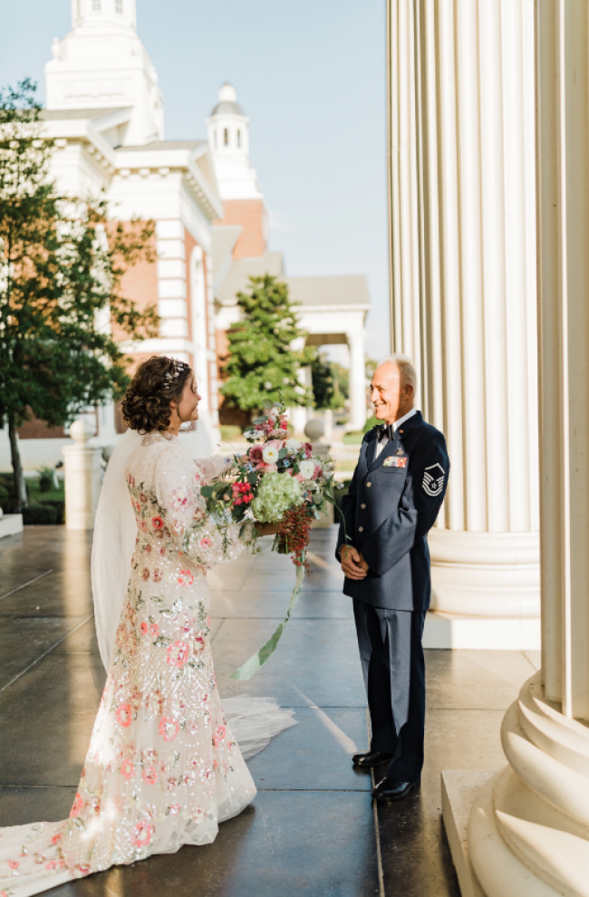 My dad served twenty-five years in the USAF. When I remembered he had a uniform I asked him to wear it, but he told me no way and that he would not fit it! A few weeks before my wedding he lost a lot of weight due to an emergency surgery, so I mentioned the suit again. He kept telling me, "No! Not happening." Much to my surprise, when I walked out the door to meet him for our first look, there he was standing there in his uniform.