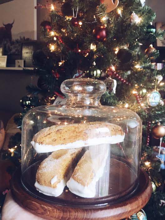 - Dip the bottom of the biscotti in the white chocolate and place on baking sheet. Refrigerate for about 15-20 minutes. Enjoy!