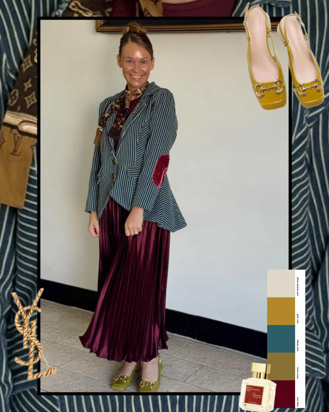 The Memorable Moments dress is one of those timeless pieces that will be a go-to in your closet for years to come! With its knit bodice and pleated skirt, it's perfect worn alone or layered! Mandy styled this burgundy dress with the cutest striped blazer and preppy neck scarf. The mustard pumps are a splash of color that complements the burgundy so well. This style is great for church or work!