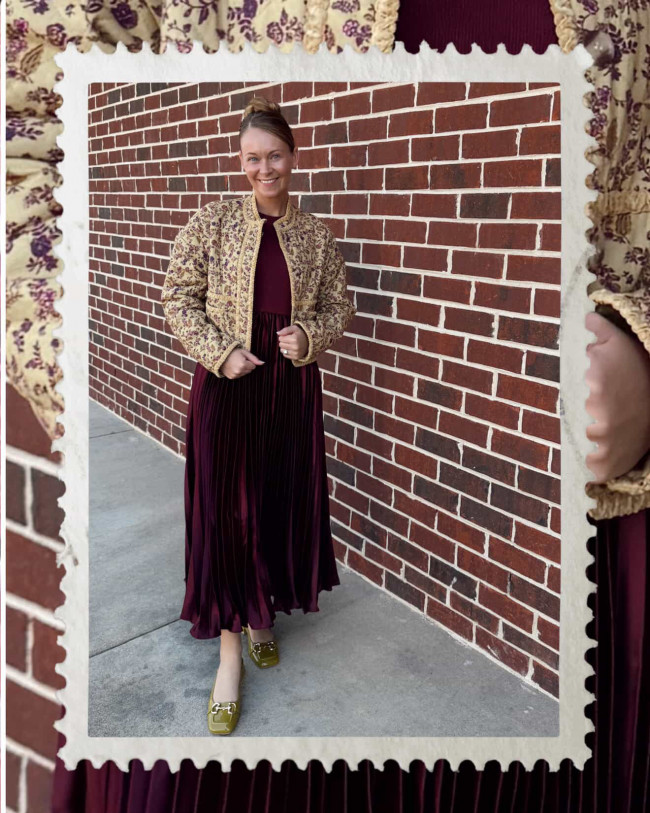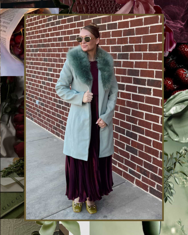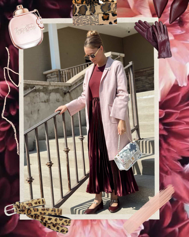 No one can deny that burgundy is in, and it pairs perfectly with so many hues. Mandy cozies up for winter with this pink over coat styled over the burgundy Memorable Moments dress. Paired with a sparkly purse and some stylish flats, the effect is darling for a date night out!
