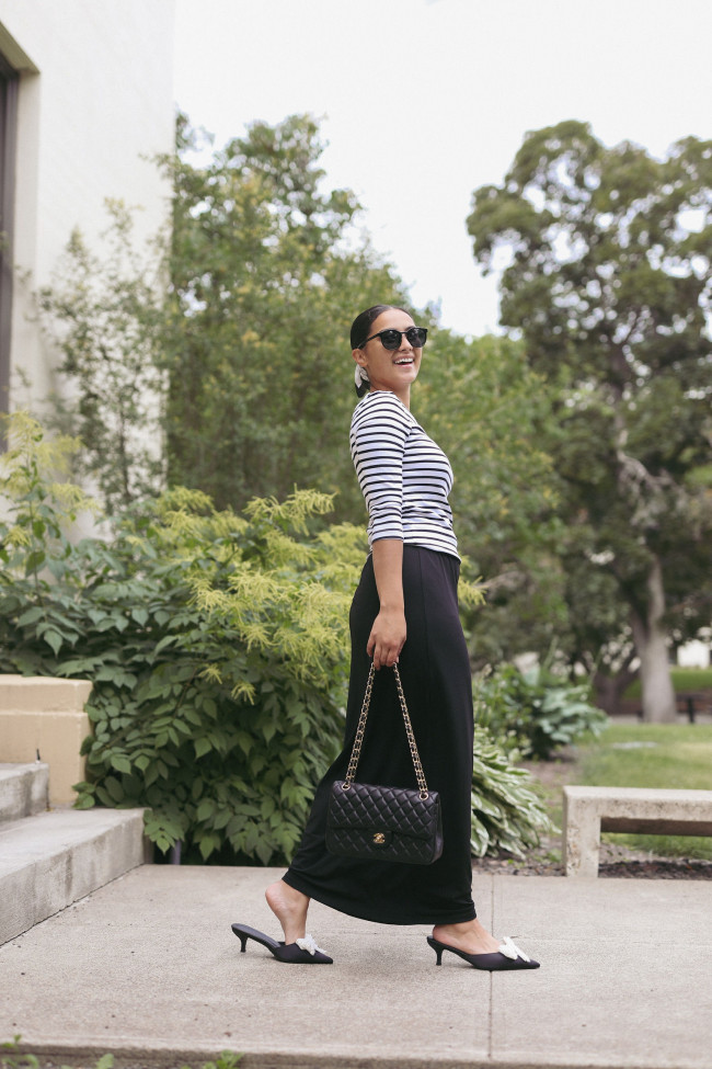 - Casual Cool: Long-sleeved blouse + maxi denim skirt + loafers + crossbody bag.